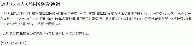 5-én a tokiói Ryogoku Kokugikan orvosi rendelőjében elvégezték a Hatsu Bashón (9-én kezdődik a Kokugikanban) bemutatkozó shindeshik orvosi vizsgálatát. A történelem első magyar rikishijével, Tóth Attilával (18, Chiganoura), és a tavalyi középiskolai yokozunával, a Saitama-beli Sawai Gótaróval (18, Sakaigawa) együtt mind a 14-en megfeleltek a fizikai követelményeknek (legalább 173 cm magasság és minimum 75 kiló).