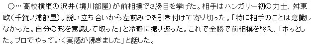 A középiskolai jokozuna, Sawai (Sakaigawa-beya) ma megszerezte harmadik győzelmét. Ellenfele az első, Magyarországról származó rikisi, Masutoo volt (Chiganoura-beya). Heves kezdés után Sawai bal kézzel megragadta ellenfele mae-mitsuját, és yorikirivel kitolta Masutoo-t. "Nem gondolkodtam sokat az ellenfélen. Ragaszkodom a saját stílusomhoz." - nézett vissza nyugodtan. A mae-zumó vereség nélküli befejezéséről azt mondta, hogy a profi szumóba belépés miatt sokat idegeskedett, de most már megnyugodott.