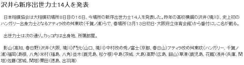 A cikk lényege, hogy a Nihon Sumo Kyokai ma hivatalosan bejelentette, hogy 14 újonc, köztük Attila sikerrel megfelelt a követelményeknek, és a márciusi tornától kezdve szerepelni fognak a banzukén.
