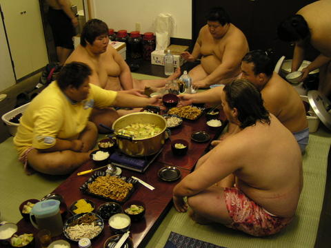 ![]() | Edzés után a mester magunkra hagyott bennünket, és a formális összeismerkedés után ért a legnagyobb öröm: megtapasztaltam hogy Attila rendkívül rokonszenves srác, akivel élvezet beszélgetni. Úgyhogy így is tettünk, és ahhoz képest, hogy azonnal indulni akartam, a következő 3 óra kellemes társalgással könnyedén elrepült (néhány téma a sok közül: mangák (mindketten rajongói vagyunk), japán filmek, a nyelvtanulás nehézségei - én semmit nem tudok, Attila viszont láthatóan remekül eltársalgott a többiekkel -, a lenyűgöző tókiói nyüzsgés, a japán lányok csinossága, pletykák, a versenyzőtársak szerencsejáték-szenvedélyéről, stb.) Panaszkodott egy, még bírkózó korában összeszedett bokasérülésére, amely ugyan a nyári hőségben békén hagyta, de most újra kínozza. Persze jónéhány, a tökéletes járatlanságomat eláruló kérdésem volt a szumóval kapcsolatban is, Attila ilyenkor hősiesen leplezte a megdöbbenését, és mindenre készséggel válaszolt. |