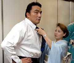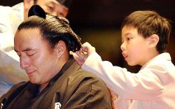 A dohjóra nők nem léphetnek, de az ojakata a zsebében vitte fel édesanyja fényképét, aki az ő középiskolás évei alatt hunyt el, és akinek leánykori nevét vette fel harci névként (sikona). A kósó-szabályok megváltoztatása? A Japán Szumószövetség (Nihon Szumó Kjókai) május 29-i ülésén elhatározta, hogy eltörli a jelenleg érvényes kósó-szabályt, vagyis azt, amikor egy birkózó a tornán szerzett sérülése után büntetlenül kihagyhat egy tornát, és megmaradhat rangjában. A ridzsicsó (vagyis a Szumó Kjókai elnöke) nem volt hajlandó megmondani, hogy mikor lép életbe ez a határozat, de a valószínű időpont 2004. januárja. Kitanoumi szerint a rikisik gyakran visszaélnek a kósó lehetőségével, mindig van néhány gyanús eset (tény, hogy az utóbbi időkben példátlan módon megszaporodtak a különféle sérülések miatti visszalépések, tornakihagyások, amelyek nem biztos, hogy teljesen indokoltak). A Kjókai ezen kívül szeretné megváltoztatni az ózekik lefokozásának szabályait is. A tervek szerint a jövőben három egymás utáni makekosi, vagyis negatív eredmény után kerülnének le szekivake rangba, és a negyedik tornán legalább 11 győzelemre lenne szükség az ózeki rang visszaszerzéséhez (szemben a jelenlegi 2 makekosi, 10 győzelem szabállyal). Takanohana mesekönyve http://www.sekaibunka.com/book/4418035117/ Május 29-én jelent meg Takanohana könyve. A címe: Csiiszana batta no otokonoko, vagyis "A kis szöcskefiú". Takanohana a történetet januári visszavonulása után kezdte írni, de az ötlet már akkor megszületett benne, amikor kényszerpihenőjét töltötte, és egymás után hét tornáról is távolmaradt. A történet három kis szöcskéről szól. Egyikük Hikaru, aki erős igazságérzettel rendelkezik, Hikaru barátja Cukasza, aki gyűlöl veszíteni, a harmadik pedig Cukasza húga, Mikadzuki. A három szöcske összefog, hogy megmentsenek egy pillangót, aki beleesett a patakba. Feladatuk, hogy megmozgassanak egy nagy követ, hogy elzárhassák a patak folyását. A könyv illusztrációit Szoja Naoki készítette. A kiadó által javasolt művészek közül Takanohana azonnal őt választotta, mondván "senki más nem lenne jó. A képei annyi derűt és szeretetet sugároznak, hogy tökéletesen illenek majd a történetetmhez." A könyvhöz tartozik egy CD is, amelyen maga Takanohana, a felesége, Keiko, és a három gyerek mondja el a mesét. A kötetet házasságuk nyolcadik évfordulójának napján jelentették meg. A könyvet az Amazonnál is meg lehet rendelni, ára 1300 jen (kb. 2500 Ft). Visszakerültek a Dzsúrjó osztályba A júliusi tornára az alábbi birkózók kerültek fel a Dzsúrjó osztályba. Mindegyikőjük szerepelt már a második osztályban, sőt néhányat ismerhetünk az elsőből (Makuucsi) is. Kelet Ms1 Kitazakura (5-2), egy torna után (ex-Makuucsi) Lehet, hogy rossz fiú, de győzni tud! Véget ért a májusi torna Tokióban Vasárnap befejeződött a Nacu Baso, az idei harmadik hivatalos szumótorna. Végülis meglepetés nélkül zárult a sorozat, Asashoryu, akinek a viselkedésével volt némi probléma, mégiscsak hozta a formáját és meggyőző eredménnyel (13-2) nyerte el immár harmadszor a Császári Kupát. Lehet, hogy a magatartása hagy még némi kívánnivalót maga után, a szumójára viszont nem lehet panasz. Legalábbis ami az eredményességet illeti. A Makunoucsi osztály eredményei A hat szumóosztály eredményei A két felső osztályban birkózók részletes eredményei Akinoshima visszavonult