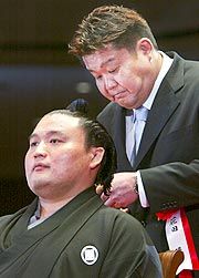 Most elkezdte a rehabilitációs programot. Sadogatake ojakata először azt akarta, hogy Kotomitsuki mégis vegyen részt a tornán, de az orvosokkal való megbeszélés után úgy döntött, hogy kihagyja, vállalva ezzel a jelentős lefokozás elszenvedését is. Hírek dióhéjban Dejima jobb térdén meniszkusz-műtétet hajtottak végre. Az ojakata elmondása szerint ez egy könnyű, nem túl jelentős műtét volt, mindössze két hetet vesz igénybe a lábadozás, ezután Dejima újra kezdheti az edzéseket. Asashóryú hazalátogatott Mongóliába, 7-én tér vissza Japánba. Takanohana ojakata végiglátogatta az ojakatákat, és megköszönte nekik, hogy részt vettek a hajlevágási szertartásán. Ezután a Futagoyama-beya edzését felügyelte. Mivel édesapja, Futagoyama ojakata kijelentette, hogy szeretne minél többet csak a szövetségbeli feladataival foglalkozni, elképzelhető, hogy a Takanohana-beya már hamarabb is létrejön. Chiyotaikai szerelmes Chiyotaikai ózeki szerelmi viszonyba keveredett a japán TV egy hírességével, Kawamura Hikaruval. A bulvárlapok szerint három éjszakát is eltöltött Kawamura lakásán, majd házassági ajánlatot tett neki. Kokonoe ojakata ezt tagadta, bár a viszonyt elismerte. Elmondta, hogy az esetről magától az ózekitől tud. "Semmi oka nincs arra, hogy hazudjon az üggyel kapcsolatban. Ha azt mondja, hogy [az ajánlat] nem igaz, akkor nem igaz. Csak annyit kértem tőle, hogy ne tegyen felelőtlen lépéseket". Chiyót és Hikarut gyakran látni együtt golfozni és a lóversenypályán, ezek kettejük közös kedvtelései. Musashimaru újra edz Június 3-án, hétfőn Musashimaru jokozuna újra rész vett egy edzésen, hogy előkészítse visszatérését a nagojai tornára. A jokozuna egymás után négy tornát volt kénytelen kihagyni makacs csuklósérülése miatt. "A csuklóm jól tartja magát" - mondta a szamoai születésű birkózó, aki egy sor könnyű edzőmérkőzést folytatott makusita-osztálybeli rikisikkel. A csuklója még erősen be volt fáslizva. Musashimaru elismerte, hogy még nem áll készen arra, hogy a két felső osztálybeli birkózókkal gyakoroljon. Musashigawa ojakata elmondta, hogy a jokozuna csak lépésről lépésre fog haladni a felkészülésben. A 2005-ös honbaso-menetrend A Nihon Szumó Kjókai kiadta a szövetség 2005-ös honbaso-menetrendjét, vagyis megállapította a tornák kezdési időpontjait, és a banzukék megjelenésének napjait. A részleteket lásd a Naptár oldalon. Takanohana hajlevágási ceremóniája