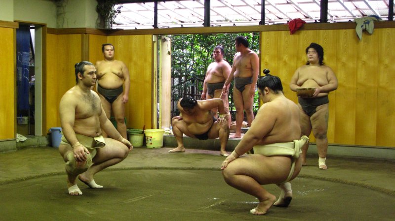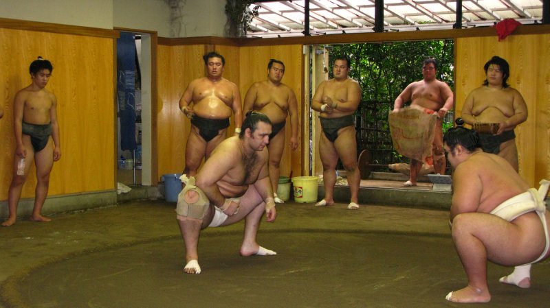 ahol ül már egy-két kíváncsi rajongó. Míg a szumó klubok látogatása