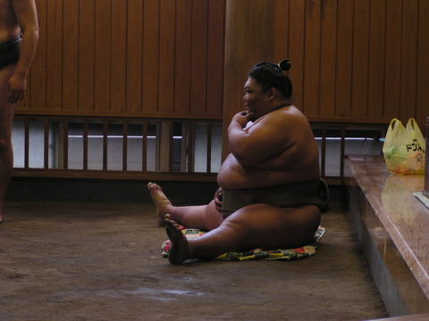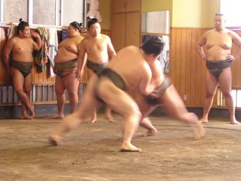 | A Takasago Beya-ban reggel 7-kor kezdődnek az edzések, engem is akkorra hívtak. Egyedüli vendégként ültem az edzőterület szélére, valóban karnyújtásnyira a versenyzőktől (10-12 versenyző volt ott, sajnos Asashoryu és a klub mestere is hiányzott aznap). |